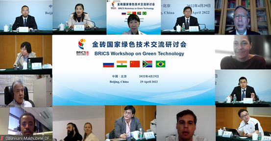 2022年4月29日,金砖国家绿色技术交流研讨会在北京以线上线下相结合的方式举办,来自巴西、俄罗斯、印度、南非的金砖国家环境部门、驻华使馆及研究机构,联合国环境规划署、联合国工业发展组织、金砖国家新开发银行,以及中国生态环境部、外交部代表和相关研究机构代表出席会议。