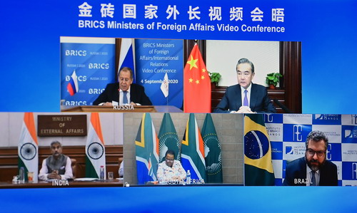 2020年9月4日晚,国务委员兼外交部长王毅在北京出席金砖国家外长视频会晤。俄罗斯外长拉夫罗夫主持会议,印度外长苏杰生、南非外长潘多尔、巴西外长阿劳若出席。